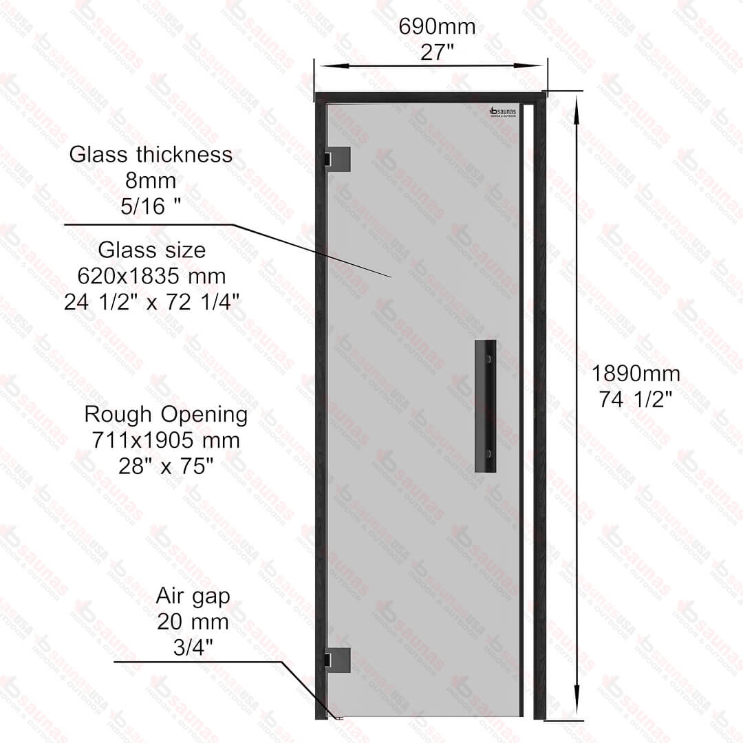 • Our standard size doors are for a rough opening of 28×75, and are available in Grey or Clear glass.